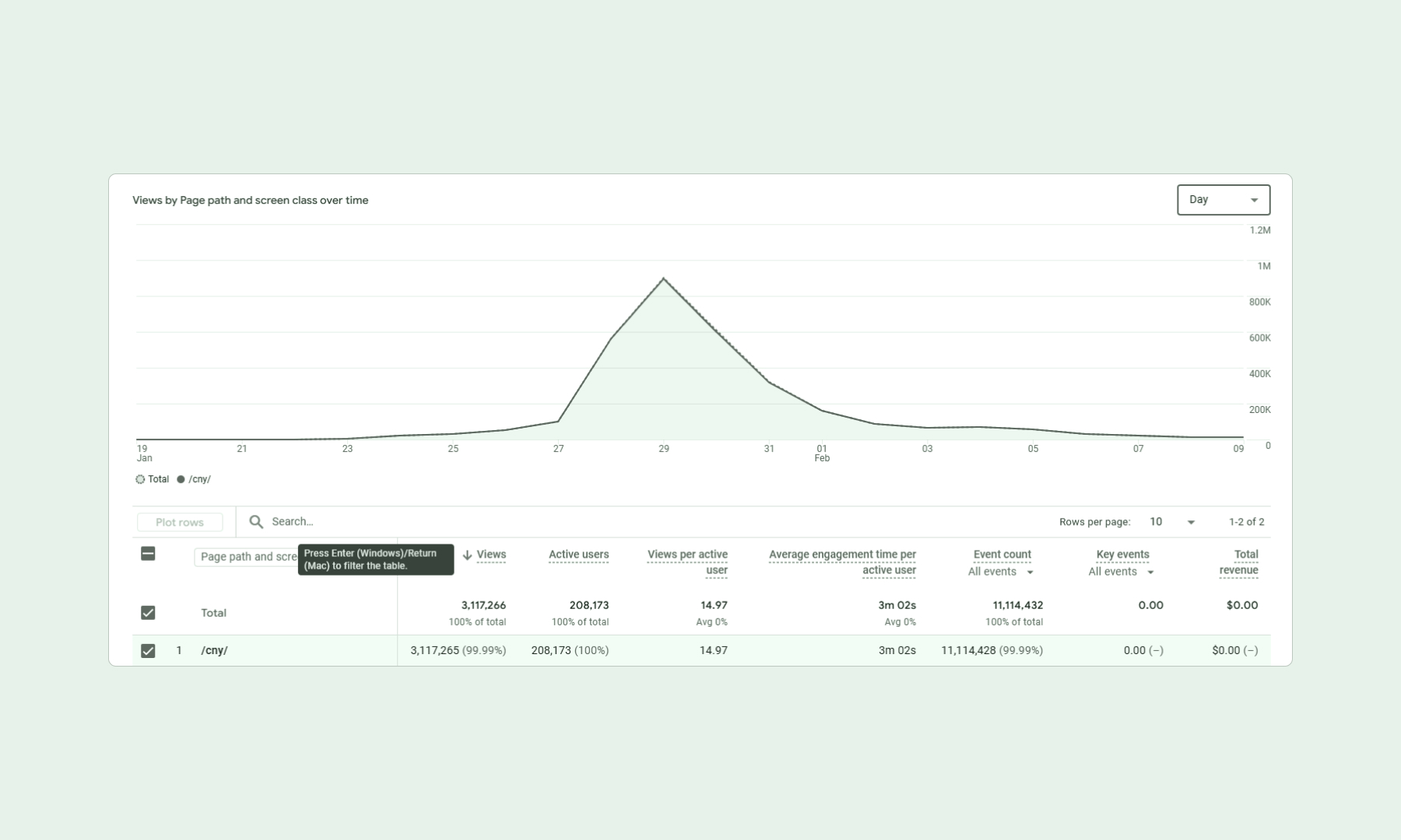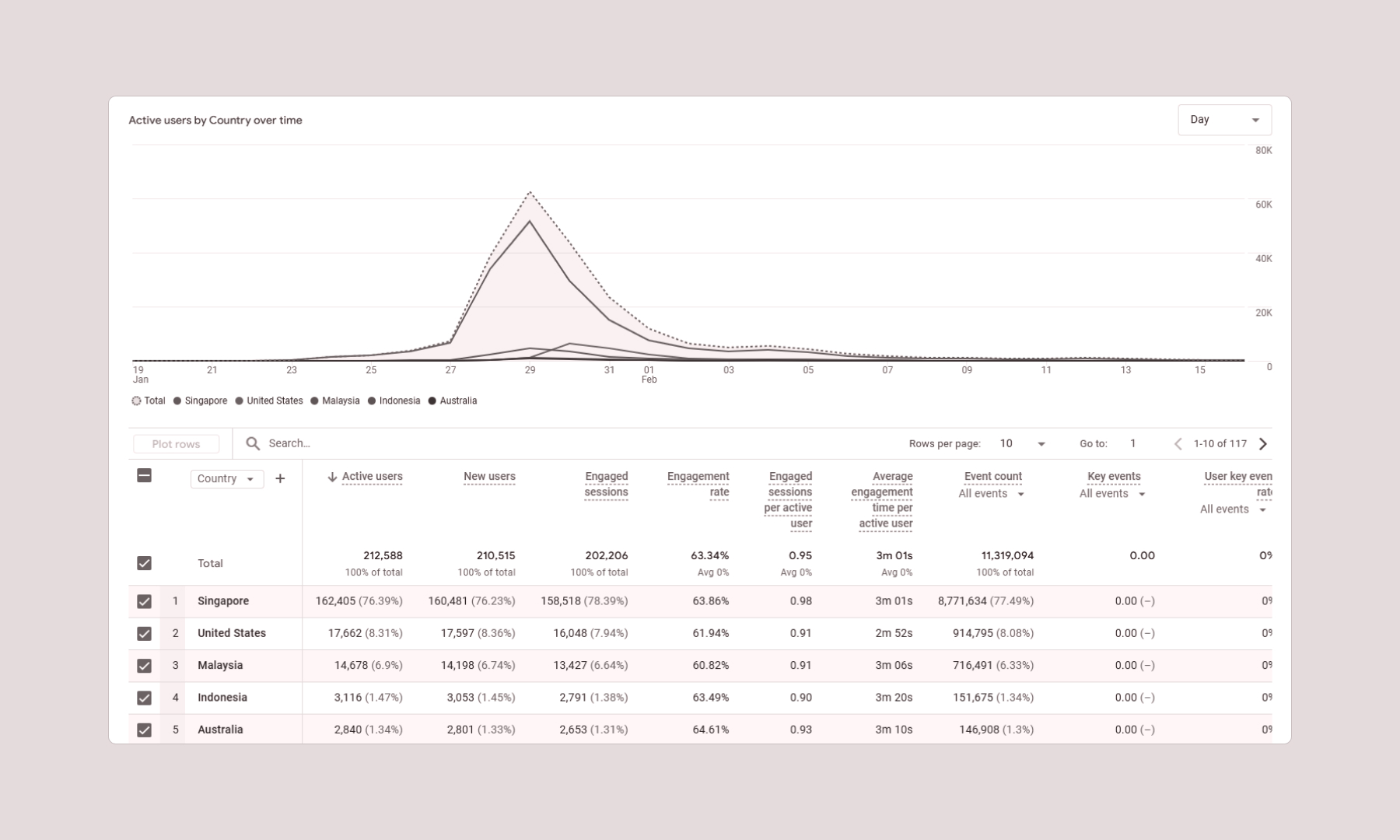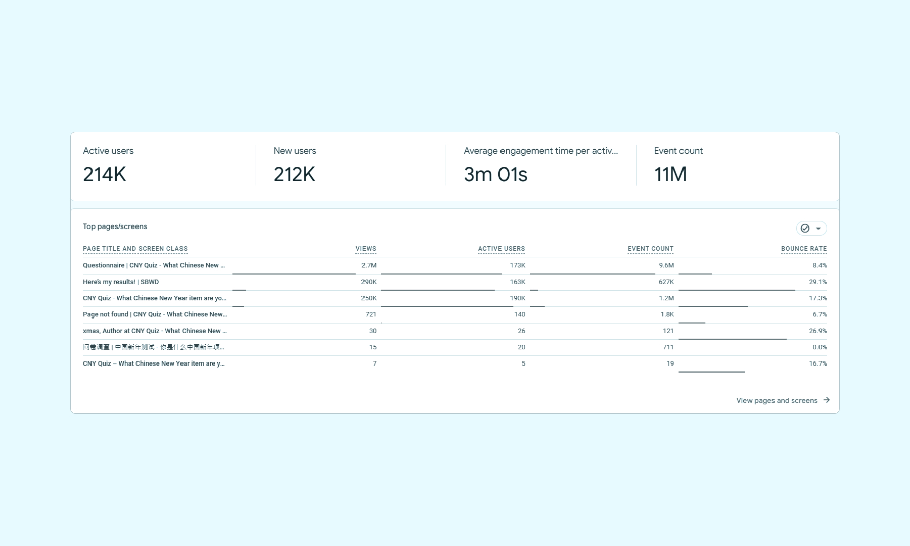 Google Analytics was embedded to capture performance data — from user location and device to bounce rates and average engagement time.