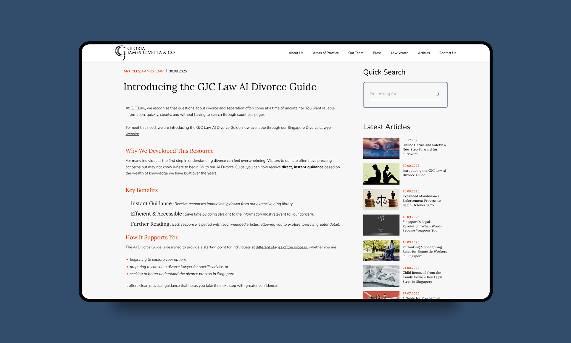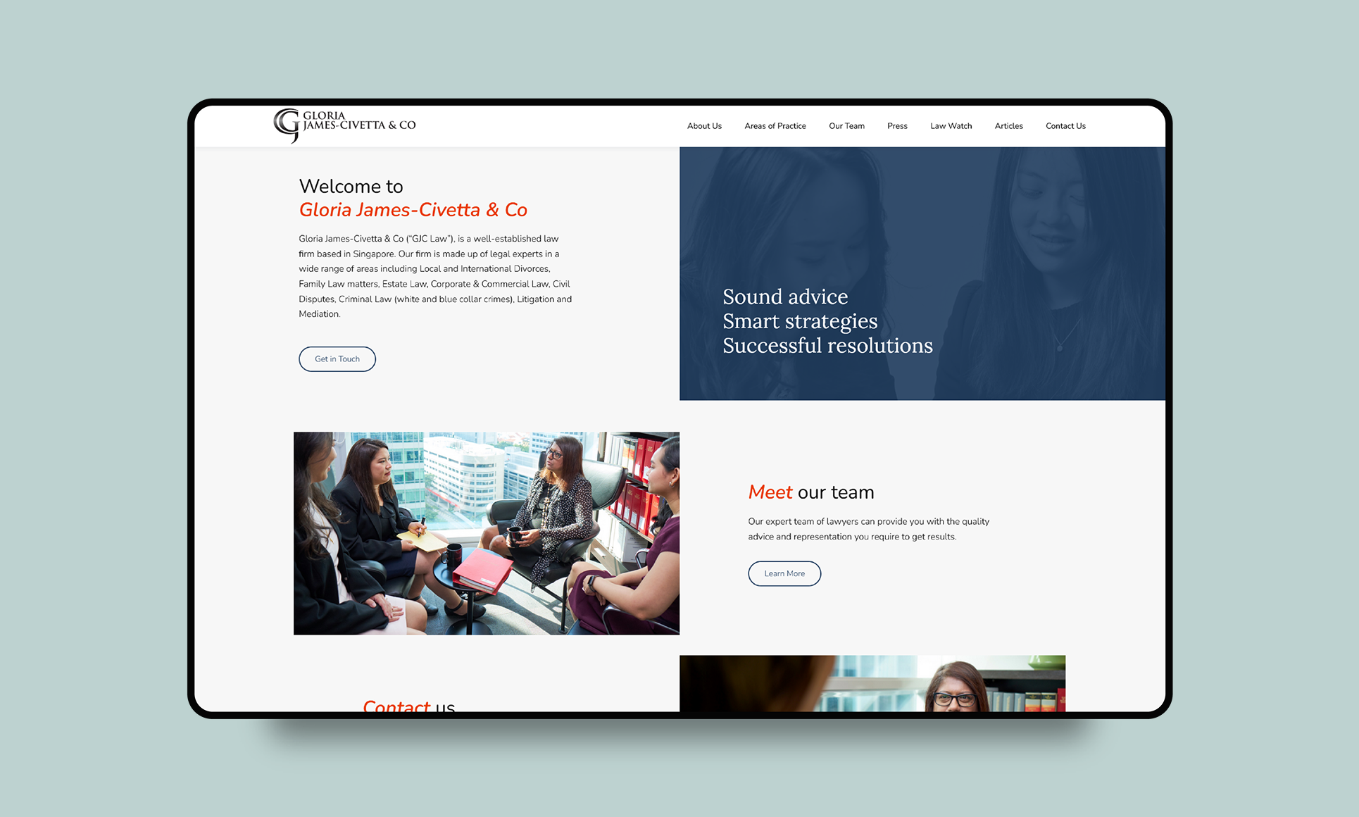 GJC Law LLP is a Singapore-based law firm specialising in corporate and commercial legal services, including mergers and acquisitions, employment law, dispute resolution, and regulatory compliance. With a focus on delivering practical, results-driven advice, GJC Law serves both local and international clients across diverse industries. SBWD collaborated with the firm to create a professional and cohesive website that clearly communicates their expertise, service offerings and client-centric approach, enhances accessibility to key legal resources, and strengthens their digital presence to better engage prospective clients and industry partners.