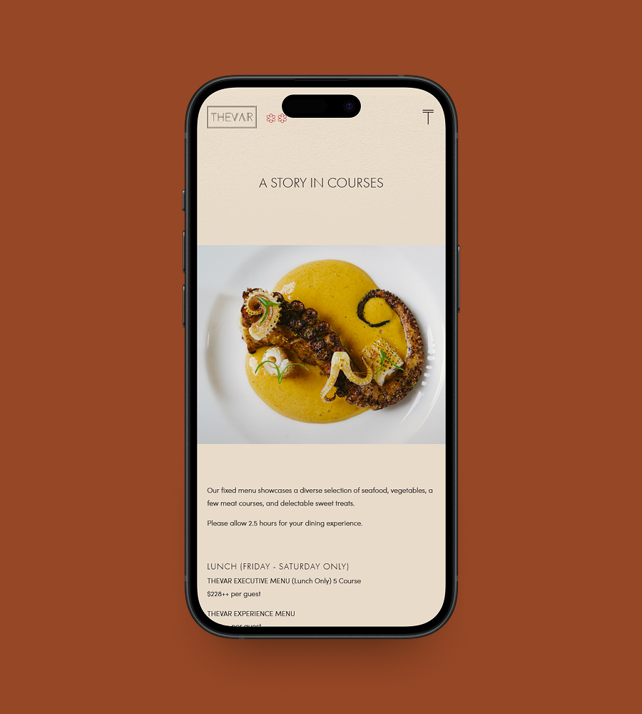 Thevar is a Michelin-recognised fine dining restaurant in Singapore that elevates Indian cuisine through creative interpretations, seasonal tasting menus and thoughtful hospitality rooted in tradition and innovation. SBWD partnered with Thevar to design a refined and evocative website that reflects the restaurant’s culinary artistry, enhances storytelling across its offerings, and elevates its digital presence to attract discerning diners and culinary enthusiasts alike.